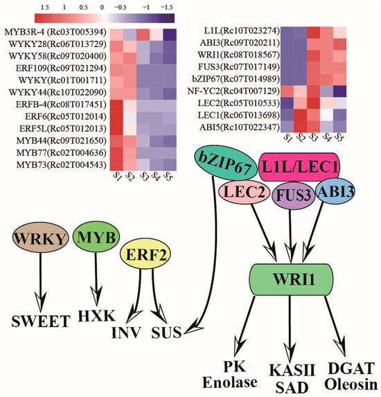 Transcription factors (TFs) play a crucial role in orchestrating seed development and TAG biosynthesis and storage in developing seeds. Various TFs, including MYB, WRKY, ERF/AP2, bZIP, and NF-Y, have been identified as critical regulators of seed development. Our analysis revealed that RcWRKY44 (Rc10T022090), RcWRKY58 (Rc09T020400), RcMYB44 (Rc09T021650), RcMYB73 (Rc02T004543), RcERF72 (Rc01T001153), RcERF74 (Rc06T014906), RcbZIP18 (Rc02T003449), RcbZIP29 (Rc07T017285), and RcNF-YC1 (Rc04T007762) exhibited higher expression levels in the early stage of developing seeds compared to the middle or late stages (Figure 4, Table S4). This suggests that these TFs are likely involved in the regulation of castor seed development and energy metabolism. For instance, WRKY, MYB, and ERF may be involved in the regulation of gene expressions encoding HXK, INV, and SUS, respectively (Figure 4, Table S5). The master TFs involved in seed development, such as Rc06T013698 encoding LEC1, Rc05T010533 encoding LEC2, Rc07T017149 encoding FUS3, Rc09T020211 encoding ABI3, and Rc08T018567 encoding WRI1, were found to be highly expressed and associated with seed development and oil accumulation (Table S4). This indicates that they play a crucial role in regulating castor seed development and oil accumulation in developing seeds. In particular, these PK, enolase, KASII, SAD, DGAT, and Oleosin genes may be directly or indirectly regulated by these master TFs, as shown in Figure 4.