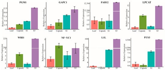 A total of 8 genes were selected to validate their expression patterns in leaf, capsules, and developing seeds in the early (S1) and middle stages (S3). The total RNAs were extracted and then reverse-transcribed to complementary DNA (cDNA) according to the method mentioned above [17]. qRT-PCR amplifications were carried out using the PerfectStart Green qPCR SuperMix kit (TransGen Biotech, Beijing, China). Three biological replicates with three technical replicates were performed for each gene and each sample. The relative expression levels of each gene were mean ± SD, employing ACTIN as reference gene. The primers used in this study were picked using Primer 3 web (v. 0.4.0, https://bioinfo.ut.ee/primer3-0.4.0/, accessed on 29 November 2023).