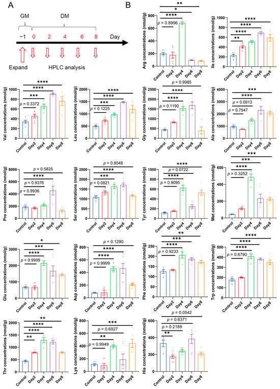 Dynamic change of amino acid levels in C2C12 myoblast differentiation. (A) The time course of C2C12 cells were sampled at 0, 2, 4, 6 and 8 days after differentiation. (B) During 0, 2, 4, 6, and 8 days of differentiation of C2C12 myoblast, the changes of different amino acids were detected by HPLC. (n = 6). The bars represent the mean ± SD. Statistical significance was determined by one-way ANOVA, comparing the mean of each column with the mean of a control column, correct for multiple comparisons using statistical hypothesis Dunnett testing. *, p < 0.05 vs. the si-Control.; **, p < 0.01 vs. the si-Control.; ***, p < 0.001 vs. the si-Control.; ****, p < 0.0001 vs. the si-Control.