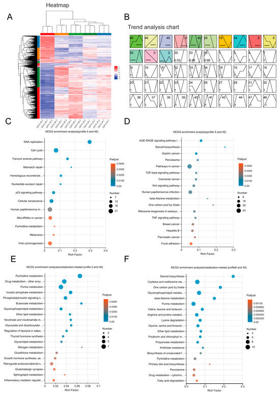 Gene expression analysis during C2C12 myoblast differentiation. (A) Heat map of row (gene) and column (sample) clustering. (B) Trend analysis of C2C12 cells at different differentiation times. Different colors represent different modules, ****, p < 0.0001 (C) KEGG enrichment of modules 0 and 49. (D) KEGG enrichment of modules 6 and 45. (E) Metabolism-related KEGG enrichment analysis of modules 0 and 49. (F) Metabolism-related KEGG enrichment analysis of modules 6 and 45.