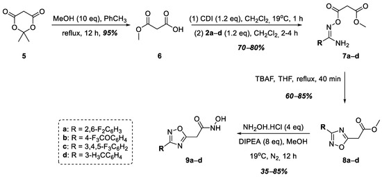 At the next stage, hydroxamic acids 9a–d were synthesized, in which the acid functional group was connected to the 1,2,4-oxadiazole heterocycle at position 5 through a methylene linker (Figure 3). At the first stage, malonic acid monomethyl ester, 6, was obtained from Meldrum’s acid, 5, according to a known procedure [36]. Then, compound 6 was activated with N,N′-carbonyldiimidazole (CDI), after which, amidoximes 2a–e were acylated to form O-acylamidoximes 7a–e in good yields. In this case, fluorine-containing 2a–c and 3-alkyl-substituted 2d were chosen as the starting amidoximes. The heterocyclization of compounds 7a–d into the target 1,2,4-oxadiazoles, 8a–d, was carried out by refluxing in THF in the presence of tetrabutylammonium fluoride (TBAF) according to a known procedure [37]. The subsequent interaction of esters 8a–d with excess hydroxylamine in the presence of DIPEA led to the formation of the target hydroxamic acids, 9a–d, in good yields (Figure 3).