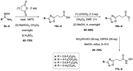A series of hydroxamic acids containing a 1,2,4-oxadiazole ring linked at position 5 of the heterocycle through methylene and phenylene linkers was then completed with compounds 17a–d containing an ethylene linker linking the heterocycle nucleus to the hydroxamic acid functional group (Figure 5). Thus, at the first stage of synthesis, aromatic amidoximes 2a–d entered into a cyclocondensation reaction with succinic anhydride neatly, according to a known procedure [39]. The resulting carboxylic acids, 15a–d, were converted into methyl esters 16a–d in good yields. At the final stage of synthesis, esters 16a–d were refluxed in methanol for 8–10 h with a large excess of hydroxylamine in the presence of DIPEA to obtain hydroxamic acids 17a–d (Figure 5).