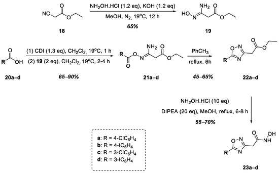 The next stage of this work was the synthesis of hydroxamic acids containing a 1,2,4-oxadiazole nucleus linked to the hydroxamic acid functional group by a methylene group at position 3 of the heterocycle (Figure 6). Thus, at the first stage, intermediate 19 was obtained via the nucleophilic addition of hydroxylamine to ethyl cyanoacetate, 18, which was then used in the synthesis without purification. Halogen-substituted benzoic acids 20a–d were activated by CDI followed by reactions with intermediate 19, which led to the formation of a series of O-acylamidoximes, 21a–d, in good yields. The target 1,2,4-oxadiazoles, 22a–e, were obtained via the heterocyclization of O-acylamidoximes 21a–e by refluxing their solution in toluene. Compounds 22a–d were converted into hydroxamic acids 23a–d in good yields under refluxing conditions using a solution of esters in methanol with an excess of hydroxylamine in the presence of DIPEA (Figure 6).
