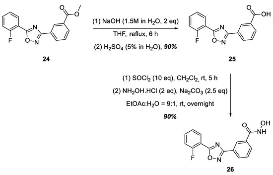 A commercially available ester, 24, was used as the starting compound for the synthesis of hydroxamic acid containing a 1,2,4-oxadiazole nucleus linked to the hydroxamic acid functional group by a phenylene group at position 3 of the heterocycle (Figure 7). Ester 24 was hydrolyzed to ataluren, 25, which was further converted to hydroxamic acid 26 in good yield via the sequential action of SOCl2 in CH2Cl2 and hydroxylamine in the presence of Na2CO3 (Figure 7).