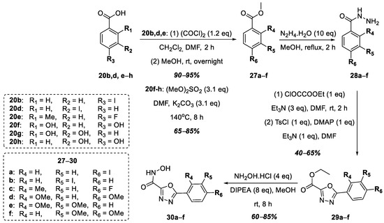 The next stage of this work was the replacement of the 1,2,4-oxadiazole nucleus with the 1,3,4-oxadiazole nucleus in the target hydroxamic acids containing the functional group of hydroxamic acid at position 2 of the heterocycle (Figure 8). In this case, the choice fell on hydroxy- and halogen-substituted benzoic acids based on the structures of the known LpxC inhibitors mentioned earlier. The synthesis began with commercially available benzoic acids, 20b,d,e–h, which were converted into esters in the case of compounds 20b,d,e, and in the case of compounds 20f–h, the hydroxyl groups were at the same time methylated to form compounds 27a–f in good yields. Further, a series of hydrazides, 28a–f, without isolation or purification were obtained from esters 27a–f, after which, compounds 28a–f were converted into 1,3,4-oxadiazoles 29a–f, according to a modified known procedure [40]. The target hydroxamic acids, 30a–f, were obtained in good yields via the reaction of excess hydroxylamine hydrochloride with esters 29a–f in the presence of DIPEA (Figure 8).
