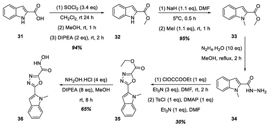 To increase the lipophilicity of the aromatic substituent at position 5 of the 1,3,4-oxadiazole ring, we decided to synthesize hydroxamic acid 36, structurally similar to acids 30a–f, containing an indole nucleus at position 5 of the heterocycle (Figure 9). Thus, 1H-indole-2-carboxylic acid, 31, was successively converted into its methyl ester, 32, and then into methyl 1-methyl-1H-indole-2-carboxylate, 33. Next, hydroxamic acid 36 was prepared similarly to the synthetic route shown in Figure 8: the formation of hydrazide 34 from methyl ester 33, followed by heterocyclization into 1,3,4-oxadiazole 35 and a reaction with hydroxylamine hydrochloride in the presence of DIPEA.