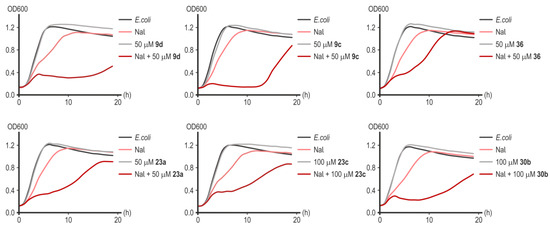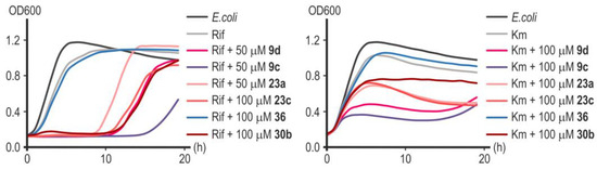 Substance 9c showed the greatest effectiveness in potentiating the action of rifampicin and kanamycin (Figure 11). Remarkably, substances 23a and 23c, which turned out to be less effective in combination with nalidixic acid (Figure 10), significantly increased the sensitivity of E. coli cells to rifampicin and kanamycin (Figure 11). Compound 30b significantly increased the sensitivity of cells to rifampicin but not to kanamycin (Figure 11). Rifampicin is not the antibiotic of choice for the treatment of infections caused by Gram-negative microflora, but increasing its effectiveness is potentially useful in preventing the development of opportunistic infections during anti-tuberculosis therapy [41]. Compound 36 was completely ineffective in combination with rifampicin or kanamycin (Figure 11). In the studied concentration range (50–100 µM), none of the substances d exhibited a toxic effect on cell growth in the absence of an antibiotic (Figure 10). However, despite the powerful bacteriostatic effect of compounds 9c and 9d in the first 10 h of incubation, we subsequently observed a resumption of culture growth, which can be explained by the metabolic transformation of the compound or by an occurrence of adaptive mutations.
