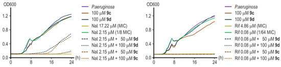 Representative growth curves of P. aeruginosa ATCC 27853 in the presence of nalidixic acid (left) and rifampicin (right) with or without 9c or 9d.