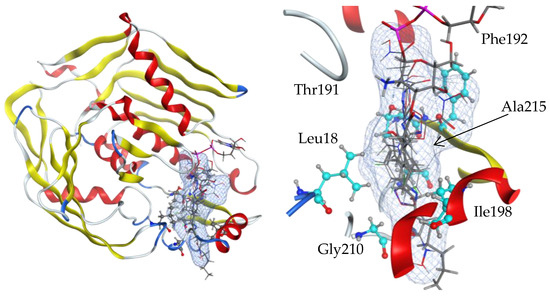 Side views of ligand-binding pockets in the structure of an LpxC protein (4mdt). Locations of 9c, 9d, 23a, 23c, 30b, and 36 ligand binding sites are the same as for the 4mdt ligand UDP-(3-O-(R-3-hydroxymyristoyl))-glucosamine (blue surface), and they include mostly hydrophobic residues: Leu18, Thr191, Phe192, Ile198, Gly210, and Ala215. Ligand interaction figures with the amino acid residues of the binding sites are given in Supplementary Materials Figures S1–S6. Full lists of amino acids involved in the interaction are given in Supplementary Materials Table S1.