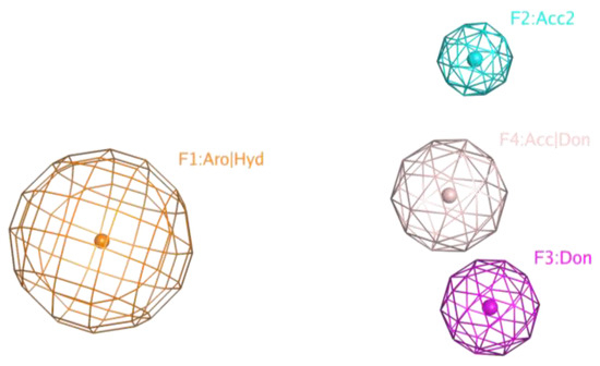 Chemical compounds were pre-aligned with the flexible alignment function of the MOE 2019 program to compose the pharmacophore model. The pharmacophore centers were selected via the Consensus option according to the maximum density of atoms in the superposition. A simple model of four pharmacophore centers finds all compounds synthesized, both active and inactive (Figure 14). Since the structure of the active compounds found does not differ significantly from inactive compounds and the differences between the two active compounds are often greater than between the active and inactive compounds, a selective pharmacophore model could not be constructed.