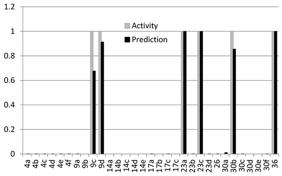 All compounds synthesized were marked in the MOE 2019 database as active (1) or inactive (0). In this case, the term activity was understood as the combined action together with the antibiotic. As mentioned above, the structure of the found active compounds differed from inactive compounds by one atom. We could not visually find a logical relationship between the active and inactive compounds, but this was possible using the QSAR method (Figure 15). Descriptors calculated from the structures of chemical compounds are often difficult to understand and logically analyze, but it is possible to build a highly efficient discriminative model from this application. It was found that the best-performing QSAR model is binary and includes 23 descriptors (Figure 15; Tables S2 and S3 in the Supplementary Materials).