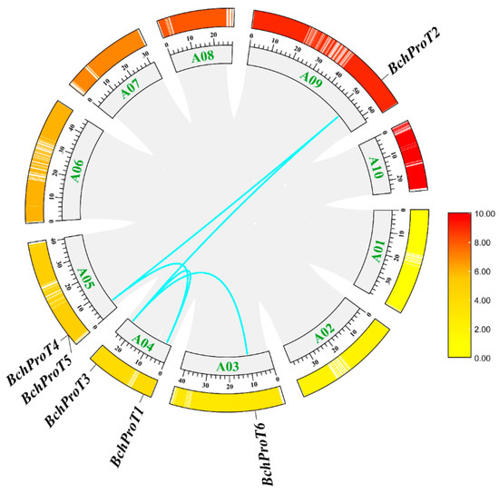 The gene–replication relationship between BchProTs. Outer ring representation gene density: red: higher expression; yellow: lower expression. The green fonts are 10 chromosomes A01–10, the blue lines represent collinear gene pairs, and the gray areas are collinear regions.