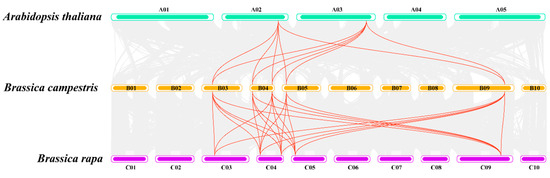 BchProTs collinearity analysis with Arabidopsis and Chinese cabbage. The gray lines in the background represent collinear blocks of the genome, and the red lines represent homologous ProT gene pairs.