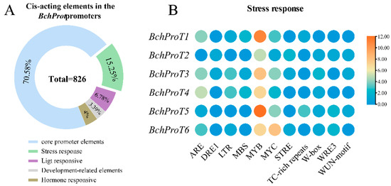 The analysis results of BchProT genes promoter sequence. (A) Functional classification of predicted cis-elements in BchProT promoter regions. % represents the percentage of the total number of components. (B) Quantity heatmap of stress responsiveness.