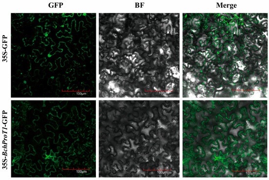 The recombinant plasmid pCAMBIA1302-35S-BchProT1-GFP was transformed into Agrobacterium rhizogenes GV3101, and tobacco leaves were transformed, with pCAMBIA1302 null as the control. After 2 days, fluorescent proteins were observed using confocal microscopy to investigate BchProT response to high-temperature stress in non-heading cabbage. BchProT1, which exhibited significant upregulation under high-temperature stress, was selected for further study. Laser confocal microscopy revealed pCAM1302 green fluorescence throughout the intact cells. Conversely, the fusion protein produced by pCAMBIA1302-35S-BchProT generated green fluorescence at the cytoplasmic membrane of the tobacco cells (Figure 7). This indicates that BchProT1 localizes to the cytoplasmic membrane of cells, which supports subcellular localization predictions. Based on these predictions and observations, it can be speculated that BchProT1 exists in the plasma membranes as part of a long-distance transport system and mediates amino acid translocation across cell membranes.