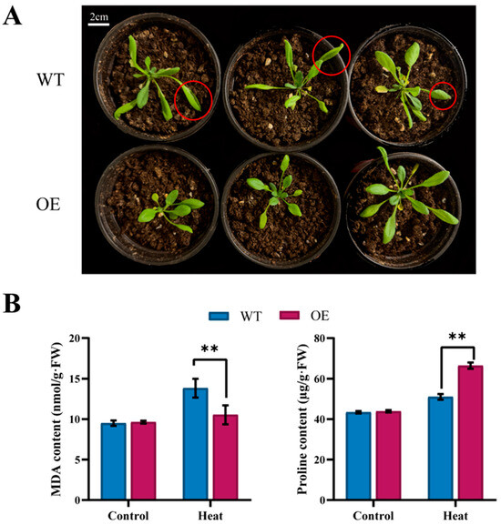 Ectopic expression of BchProT1 in Arabidopsis. (A) Heat stress Arabidopsis phenotype. Red circles highlight the phenotypic changes of wild Arabidopsis under heat stress. (B) Heat stress Arabidopsis MDA and Proline content. WT represents wild-type plants; OE represents highly expressed transgenic lines; Heat represents (40 °C for 12 h). ** indicates extremely significant difference (p value < 0.01). All bars represent means ± SD (n = 3).
