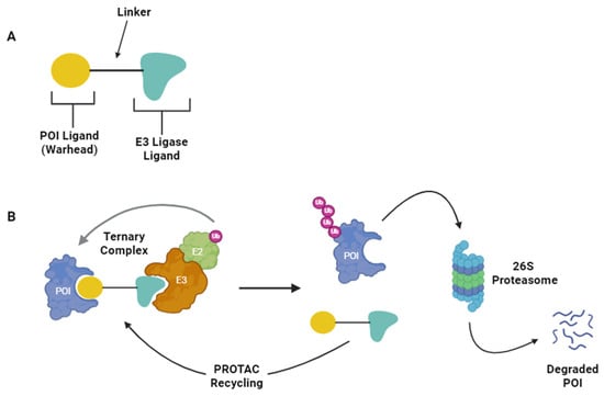PROTAC structure and mechanism of action (MOA): (A) the PROTAC structure includes a warhead that binds the POI, a linker, and an E3 ligase ligand; and (B) the PROTAC MOA includes the formation of a ternary complex comprised of the POI, the PROTAC, and the E3 ligase. The transfer of Ubiquitin to the POI leads to its proteolytic degradation by the proteosome, while the PROTAC is recycled and can engage another molecule of POI. Figure created with BioRender.com.