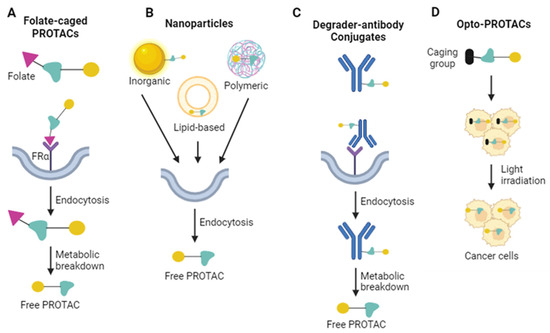Methods to improve selective delivery of PROTACs in EOC: (A) conjugation of folate to PROTACs results in selectivity for cells expressing FRα; (B) inorganic, lipid-based, and polymeric nanoparticle-based PROTAC delivery; (C) conjugation of PROTACs to antibodies facilitates selective delivery; and (D) light irradiation removes the caging group on opto-PROTACs, activating the PROTAC. Created with BioRender.com.