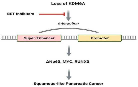 KDM6A is an essential gene that impacts developmental processes and cancer progression. The lack of KDM6A results in changes to the activity of primary enhancers and super-enhancers, which are crucial to controlling gene expression [36]. Consequently, this disruption in gene regulation during development can also facilitate cancer progression. Such disturbances in gene expression mainly affect the transcription of essential genes like Np63, MYC, and RUNX3 [19,25,36,149,150,151]. These genes play critical roles in squamous cell differentiation and the spread of cancer, underscoring the importance of KDM6A in both developmental regulation and cancer prevention (Figure 1). According to the findings, loss of KDM6A activates gene signatures associated with IL-6 signaling, a pathway implicated in desmoplasia [152,153]. In addition, the upregulation of RUNX3 may contribute to the formation of desmoplastic and metastatic niches [151]. SE reprogramming is a pivotal step in metastatic pancreatic cancer across multiple subtypes, including those of squamous-like and pancreatic progenitor subtypes [142]. This understanding opens avenues for utilizing SE reprogramming signatures as biomarkers to stratify patients with aggressive forms of PDAC, potentially guiding more personalized treatment approaches. Fortunately, it has been demonstrated that despite varying SE reprogramming patterns, these subtypes exhibit sensitivity to BET inhibitors. Several BET inhibitors have shown promise as adjuvant therapies in treating squamous-like and metastatic pancreatic cancers, particularly in KDM6A-deficient PDACs [36]. The identification of sensitivity to BET inhibitors in specific PDAC subtypes could lead to targeted therapy protocols, improving patient outcomes by selectively inhibiting cancer progression where KDM6A mutations are present. They enhance the effectiveness of current therapies by restoring cell identity. The BET inhibitor JQ1 is particularly effective in inhibiting squamous differentiation and controlling Kdm6a-null pancreatic cancer in vivo. Further research could explore the integration of JQ1 and similar inhibitors into standard treatment regimens, potentially establishing a new standard of care for this patient subgroup. Hence, BET inhibitors like JQ1 may be useful for reversing the effects of KDM6A mutations in specific pancreatic cancer types.