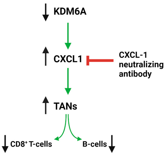 CXCL1 functions as a chemoattractant, guiding the movement of immune cells through concentration gradients. CXCL1 plays a dual role by facilitating the recruitment of TANs, thereby promoting tumor growth and diminishing the CD8+ T cell population, weakening the immune defense against the tumor [159,160]. The study by Yang et al. reinforced these findings, emphasizing the impact of KDM6A deficiency on PDAC’s TME [158]. The study also highlights the potential of targeting the CXCLs–CXCR2 axis as a therapeutic strategy in PDAC cases with KDM6A loss. They used a genetically engineered, pancreas-specific KDM6A-knockout PDAC mouse model and human PDAC tissue samples to demonstrate that KDM6A loss correlates with increased TANs and neutrophil extracellular trap (NET) formation, which are known to contribute to PDAC progression (Figure 3). Moreover, transcriptomic analysis showed that the expression of many chemotactic cytokines, especially CXCL1, were upregulated in KDM6A-knockout PDAC cells. This molecular insight suggests that targeting the CXCLs–CXCR2 axis could serve as a therapeutic strategy in PDAC cases with KDM6A loss. Additionally, identifying patients with altered KDM6A expression could facilitate the stratification of PDAC cases into those likely to respond to CXCL1-neutralizing treatments. In a mouse model, treatment with a CXCL1-neutralizing antibody blocked the chemotactic and NET-promoting properties of KDM6A-deficient PDAC cells and suppressed tumor growth, highlighting its potential as a targeted treatment strategy. This approach could be further validated in clinical trials aimed at improving patient outcomes by exploiting this newly understood pathway.