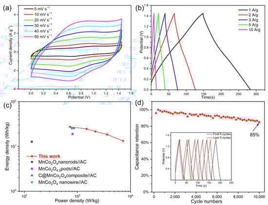 - Kuang, L.; Ji, F.; Pan, X.; Wang, D.; Chen, X.; Jiang, D.; Zhang, Y.; Ding, B. Mesoporous MnCo2O4.5 nanoneedle arrays electrode for high-performance asymmetric supercapacitor application. Chem. Eng. J. 2017, 315, 491–499. [Google Scholar] [CrossRef]