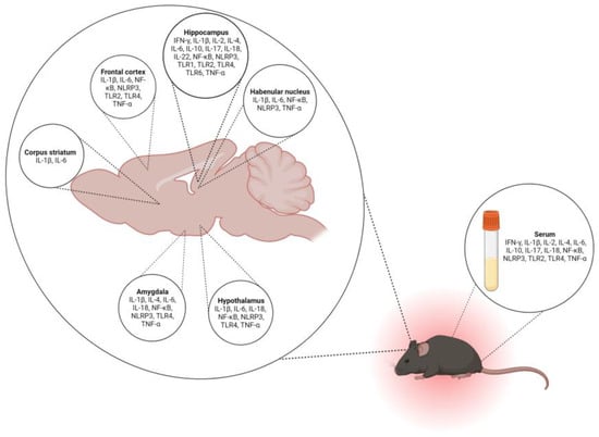Rodent models of chronic stress promote inflammatory cytokines, similar to those observed in patients with MDD [] and allow for the evaluation of brain-region-specific neuroinflammatory changes or changes in circulation (Figure 1). Below, we discuss inflammatory mediators and cytokines that are affected by chronic stress paradigms in rodents and discuss their relevance to health and disease. We focus on studies reporting the amelioration of chronic-stress-induced neuroinflammation through gene expression manipulation, and conventional or alternative medicine approaches. Alternative medicine largely exists outside of conventional health care, but some approaches are becoming increasingly integrated into the Western health-care system []. However, compared to conventional therapy, there is a lack of comprehensive preclinical and clinical studies on most types of alternative medicine practices. Exploring the mechanisms of both conventional and alternative medicine may reveal novel targets for antidepressant treatments.