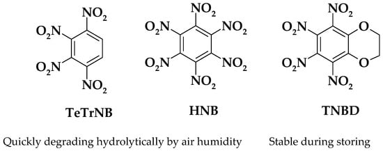 It is generally known that more nitro groups affording benzenes with higher energy suffer from lower chemical stability []. Similarly, higher levels of nitration also induce reduced hydrolytic stability. 1,2,3,4-Tetranitrobenzene is an impact-sensitive explosive that easily decomposes in the presence of moisture to 2,4-dinitro-1,3-dihydroxy benzene. Hexanitrobenzene (HNB), another well-known and extremely potent nitroarene explosive [,,], easily hydrolyzes to trinitrophloroglucine when exposed to air humidity [,]. Contrary to these HNB properties, the TNBD compound synthesized in this work exhibited good chemical stability under normal conditions (Figure 2).