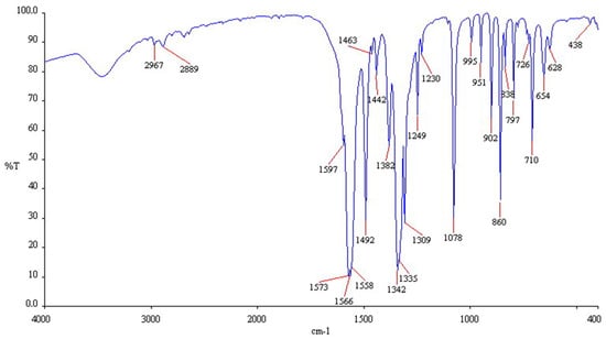 FT-IR spectrum (cm−1): 2967, 2889, 1597, 1573, 1566, 1558, 1492, 1442, 1382, 1342,1335, 1309, 1249, 1230, 1078, 995, 951, 902, 860, 838, 797, 778, 726, 710, 654, 628, 438.