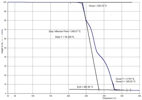 The results of the thermal analysis (TGA) obtained from the twice re-crystallized material revealed the onset at 240 °C (partial sublimation started) and melting at 286 °C. The investigated material degraded completely at 290–329 °C, indicating that the thermostability of TNBD is very close to that of HNS (hexanitrostilbene), also known as a thermostable HEM [].