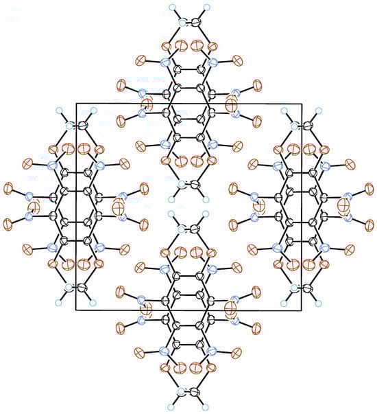This study was further undertaken to establish the three-dimensional structure and density of TNBD. The crystals of TNBD for its X-ray diffraction were obtained by slow evaporation at room temperature of the solution in 2-butanone. The geometries of TNBD are tabulated below. All the diagrams and calculations were performed using maXus (Bruker Nonius, Delft, The Netherlands and MacScience, Yokohama, Japan). The TNBD crystal cell packing is shown in Figure 6.