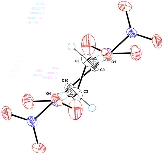 ORTEP representation of TNBD. Carbon atoms are represented in black color, nitrogen—in blue and oxygen—in red. The thermal ellipsoids are presented with 50% probability (CCDC 2320894) (crystal was grown from 2-butanone).
