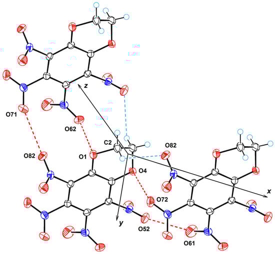 The packing of TNBD molecules in the crystal lattice is quite dense. The packing index, calculated using Kitaigorodsky’s approach [,], is equal to 0.745. The crystal structure is characterized by strong intermolecular sigma-hole interactions (see Figure 9). The distance between the O52 and O61 atoms of the neighboring molecules is 2.910(2) Å (the same distance occurs between the atoms O82 and O71 due to symmetry). Also noteworthy is the strong interaction between atoms O1 and O62 (as well as atoms O4 and O72), which is characterized by a distance of 2.910(2) Å. In addition, the carbon atom C2 (like C3) has increased electronegativity because it is bonded to oxygen. This promotes the formation of the intermolecular hydrogen bonds of CH···O type (see in Figure 9). The parameters of this H-bond are the following: C2···O82 = 3.321(3) Å, H2B···O82 = 2.75(2) Å and C2-H2B···O82 = 122(3)°; i.d., this bond is quite weak. Nevertheless, it participates in stabilizing the crystal structure. By means of these intermolecular interactions and hydrogen bonds, the molecular chains along the long parameter of the lattice are formed in the crystal structure. The consequence of these features of the crystal structure of TNBD is a significant packing index value and, in accordance with this, a quite high density of the substance.
