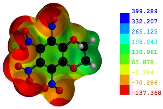 The surface of the electrostatic potential (MEP) of TNBD, calculated by the DFT-B3LYP/6-311G(d,p) method. The colors red and blue depict the compound’s negatively and positively charged regions (MEP isovalue = 0.002).