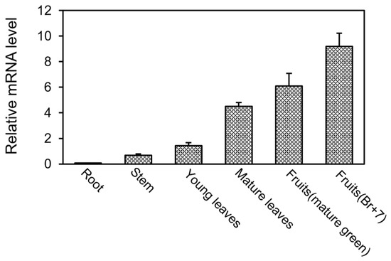 To investigate the expression pattern of the SGR1 gene, qRT-PCR was performed by isolating mRNA from the tissues of the tomatoes at each development stage. The expression of the SGR1 gene in the roots, stems, and young leaves showed low levels. However, the expression of the SGR1 gene according to the development stage of the mature leaves and fruits was high, and it was highest in the Br+7 stage (Figure 1).