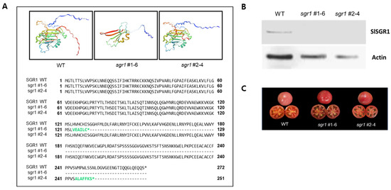 Protein structure and expression analysis of sgr1 null lines. (A) Protein structure analysis of sgr1 null lines. Green letters indicate protein sequences translated by frameshifting and premature termination. Asterisks indicate stop codon. (B) Western blotting analysis for expression levels of SGR1. (C) Phenotype of fruit (Br+7) obtained from the sgr1 null lines.