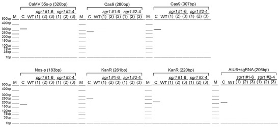 Electrophoretic patterns after PCR analysis of sgr1 null lines. Three plants per mutant line were used for analysis. M; 500 bp marker, C; PCR product amplified from pKAtC vector.
