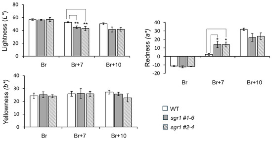 Colorimetric evaluation of sgr1 null lines at the ripening development stage. The bars show a significant difference (* 0.01 < p < 0.05, ** 0.001 < p < 0.01) between WT and sgr1 null lines (Bonferroni’s test). Vertical bars show the standard error of the mean for three replicates.