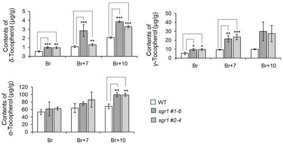 Tocopherol contents of WT and sgr1 null lines at the ripening development stage. The bars show a significant difference (* 0.01 < p < 0.05, ** 0.001 < p < 0.01, *** p < 0.001) between WT and sgr1 null lines (Bonferroni’s test). Vertical bars show the standard error of the mean for three replicates.