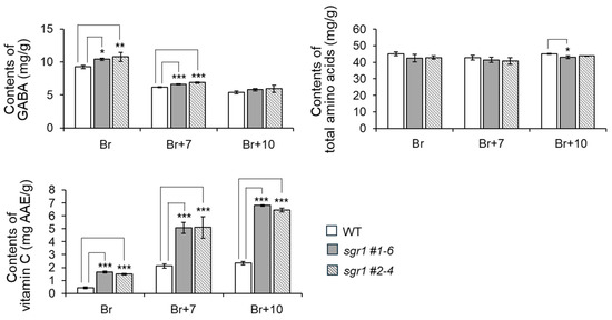 Free amino acid contents of WT and sgr1 null lines at the ripening development stage. The bars show a significant difference (* 0.01 < p < 0.05, ** 0.001 < p < 0.01, *** p < 0.001) between WT and sgr1 null lines (Bonferroni’s test). Vertical bars show the standard error of the mean for three replicates.