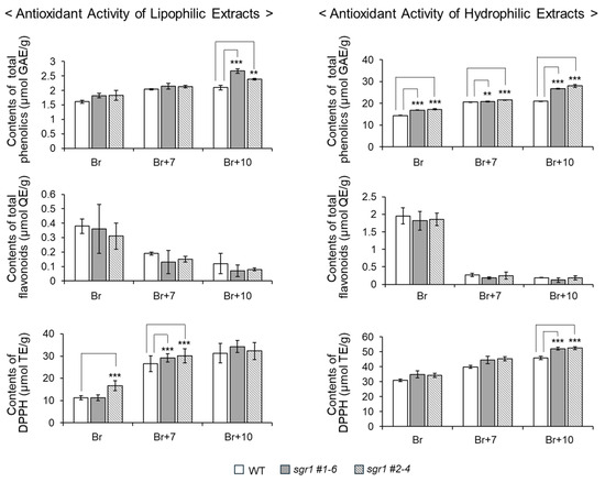 The total phenol contents of the lipophilic extract did not show a significant difference between the sgr1 null lines and WT. However, the total phenol contents of the hydrophilic extracts of the sgr1 #1-6 and sgr1 #2-4 lines were 27.2 ± 1.3 and 20.3 ± 0.2 µmol GAE/g, respectively, which were higher than those of the wildtype. In addition, the total flavonoid content of the hydrophilic extracts of the sgr1 null lines were 10.8 µmol QE/g, which was higher than that of the wildtype. The antioxidant activity was measured by a DPPH radical scavenging analysis using lipophilic and hydrophilic extracts. In the sgr1 #1-6 and sgr1 #2-4 null lines, the DPPH radical scavenging activity of the hydrophilic extract was 1.2-3.2 times higher than that of the WT. Also, the antioxidant activity of the lipophilic and hydrophilic extracts of the sgr1 #1-6 and sgr1 #2-4 lines, with values of 27.3 ± 3.5 and 27.4 ± 1.8 (mol trio lox equivalents (TE)/g, respectively, was higher than that of the wildtype (Figure 7, Supplementary Table S2).