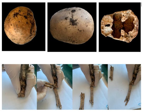 According to current recommendations for sampling forensic structures, the most appropriate bones for isolating and analyzing DNA from skeletons are compact ones, particularly long bones (the femur and tibia) and teeth. Conversely, flat and spongy bones, like the skull, vertebrae, and ribs, are less suitable [,]. The best skeletal component for sampling prehistoric skeletal remains, according to Pinhasi et al., is the petrous section of the temporal bone []. Pilli et al. report similar findings, demonstrating that DNA is better preserved in the petrous portion of the temporal bone than in the femur and teeth. They conclude that this results from the high bone density in the temporal bone’s petrous region, which increases resistance and reduces bacterial DNA damage [].