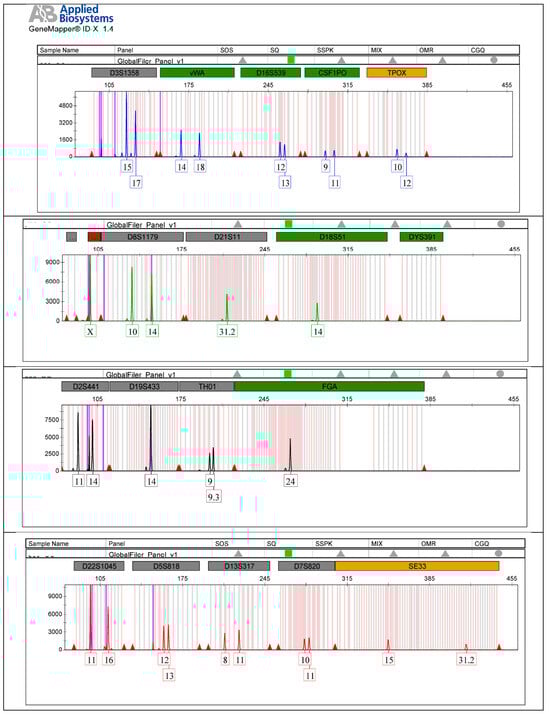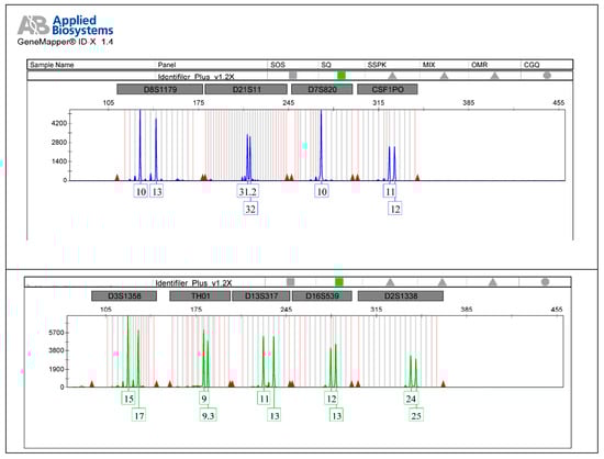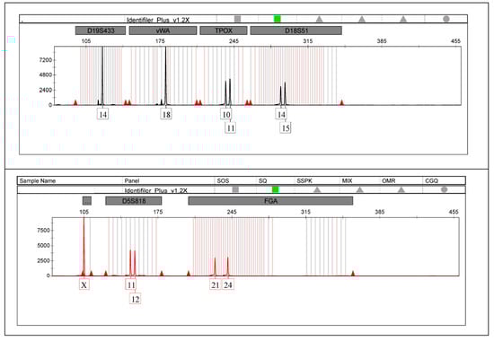 Target sequences were amplified starting from extracted DNA, using a thermocycler ProFlex PCR System (Applied Biosystems, Waltham, MA, USA) and the AmpFLSTR Identifier Plus PCR Amplification Kit (Applied Biosystems, Waltham, MA, USA) or Global FilerTM PCR Amplification Kit (Thermo Fisher Scientific, Waltham, MA, USA). In case 5, along with the AmpFLSTR Identifier Plus PCR Amplification Kit (Applied Biosystems, Waltham, MA, USA), the AmpFLSTR Y filer (Applied Biosystems, Waltham, MA, USA) was used.