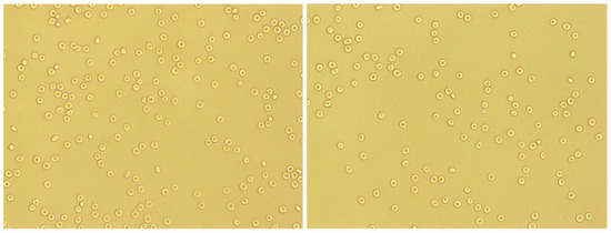 Phase contrast microphotographs of control erythrocytes (left) and erythrocytes incubated with 50% garlic extract (right). Magnification: 400×.