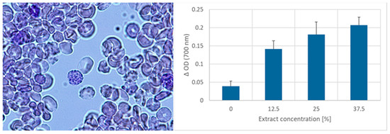 Heinz bodies are formed in erythrocytes incubated with the garlic extract. (Left) Erythrocytes were incubated with 50% garlic extract for 1 h at 37 °C and stained supravitally with methyl violet. Magnification: 1000×. (Right) Difference in the optical density of hemolysates before and after centrifugation as a measure of the content of Heinz bodies.
