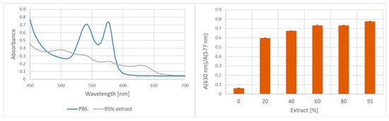 After incubation with the extract, the erythrocytes were sedimented and hemoglobin concentration was measured in the supernatants. As oxidation of hemoglobin took place in the presence of the extract, absorbance was measured at 527 nm, an isosbestic point in the hemoglobin/methemoglobin system.