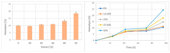 Hemolysis induced by incubation of erythrocytes with the garlic extract. (Left) immediate hemolysis; (Right) time course of hemolysis during post-exposure incubation at 4 °C.