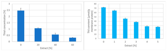 Effect of incubation with the garlic extract on the concentration of erythrocyte acid-soluble thiol groups (left) and the membrane content of thiol groups (right).