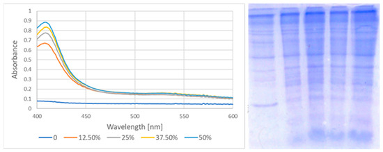 Binding of hemoglobin to membranes in erythrocytes incubated with various dilutions of the garlic extract. (Left) Absorption spectra of erythrocyte membranes dissolved in 1% SDS. Concentration of the extract. (Right) SDS-PAGE electropherograms of membrane proteins of erythrocytes incubated with the garlic extract. Extract concentrations (from left to right): 0%, 12.5%, 25%, 37.5%, and 50%.