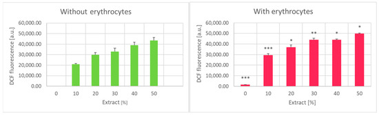 Effect of garlic extract on the level the oxidation of H2DCF-DA in the absence (left) and in the presence of erythrocytes (right). * p < 0.05, ** p < 0.01, *** p < 0.001 (DCF fluorescence in the presence of erythrocytes vs. in the absence of erythrocytes).