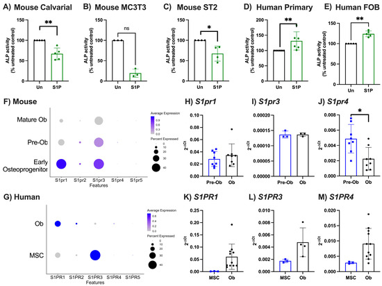 Initially, we investigated the functional impact of a single concentration of S1P on osteoblast maturation using primary murine and human osteoblasts, two murine cell lines (ST2 and MC3T3-E1), and a human cell line (hFOB) (Figure 1A–E). S1P treatment significantly reduced osteoblast maturation, as measured by ALP activity, in all murine cells used compared to untreated controls (Figure 1A–C). By contrast, ALP activity was significantly increased in primary human osteoblasts and hFOB treated with S1P compared to untreated cells (Figure 1D,E). These data indicate species-specific osteoblast responses to S1P.